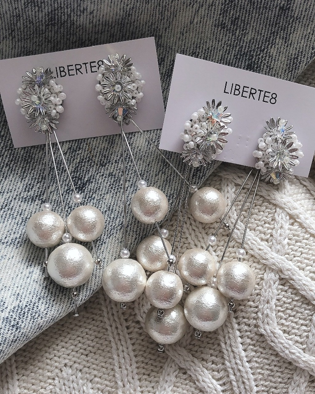 上品な風合いの、コットンパールが連なってカーブするデザインが、目を引くハンドメイドアクセサリーです。